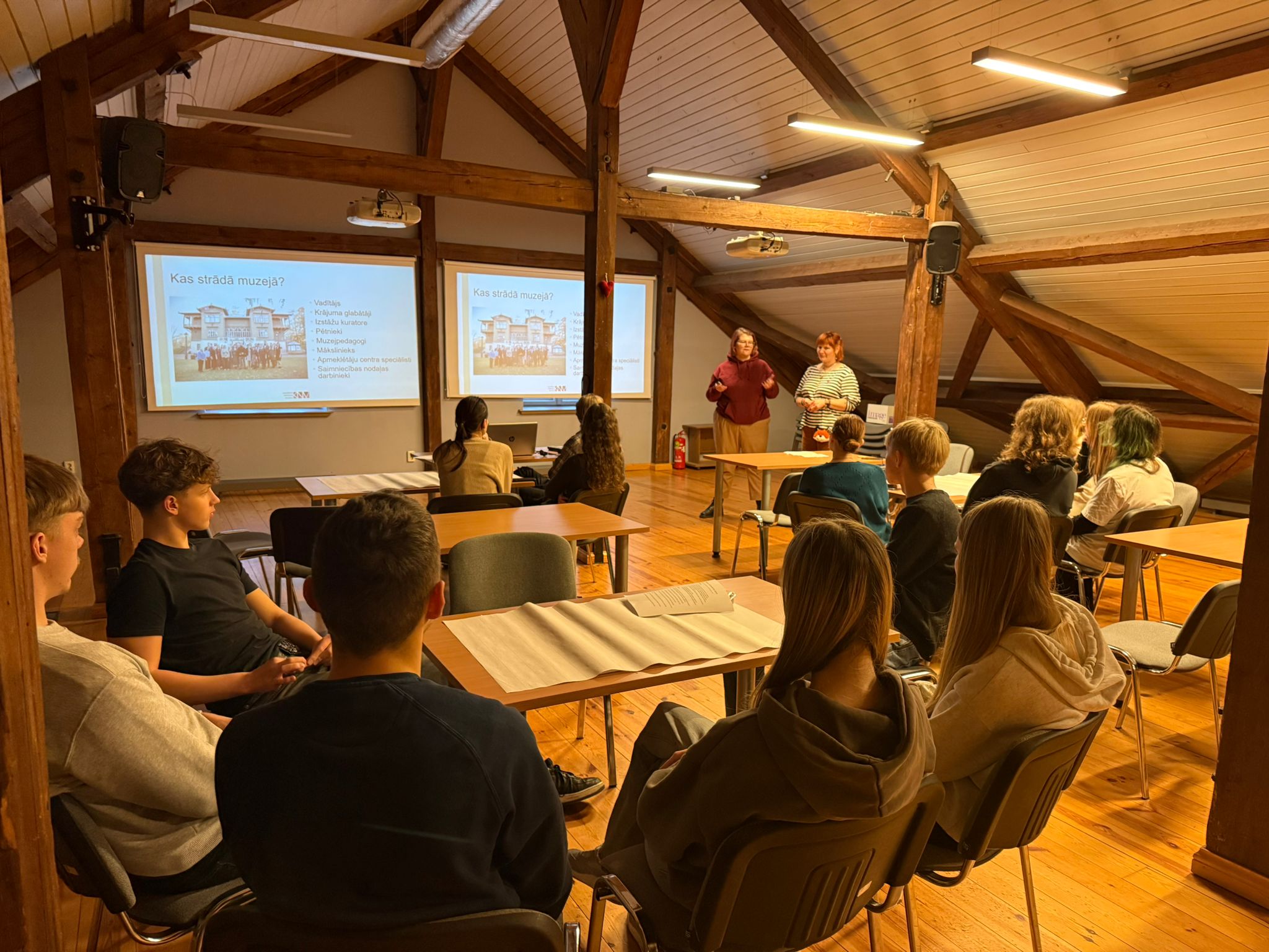 Turpinājumā jaunieši uzklausīja kultūras speciālistu stāstījumu par savu ikdienas darbu – pienākumiem, izaicinājumiem un to, kā top dažādas kultūras norises Kuldīgas novadā. Muzeja speciālistes skolēniem piedāvāja vizuālu prezentāciju, kas atklāja Kuldīgas muzeja darba specifiku un aizkariņu aizvarus, kas ikdienas apmeklētājiem paliek neredzami.