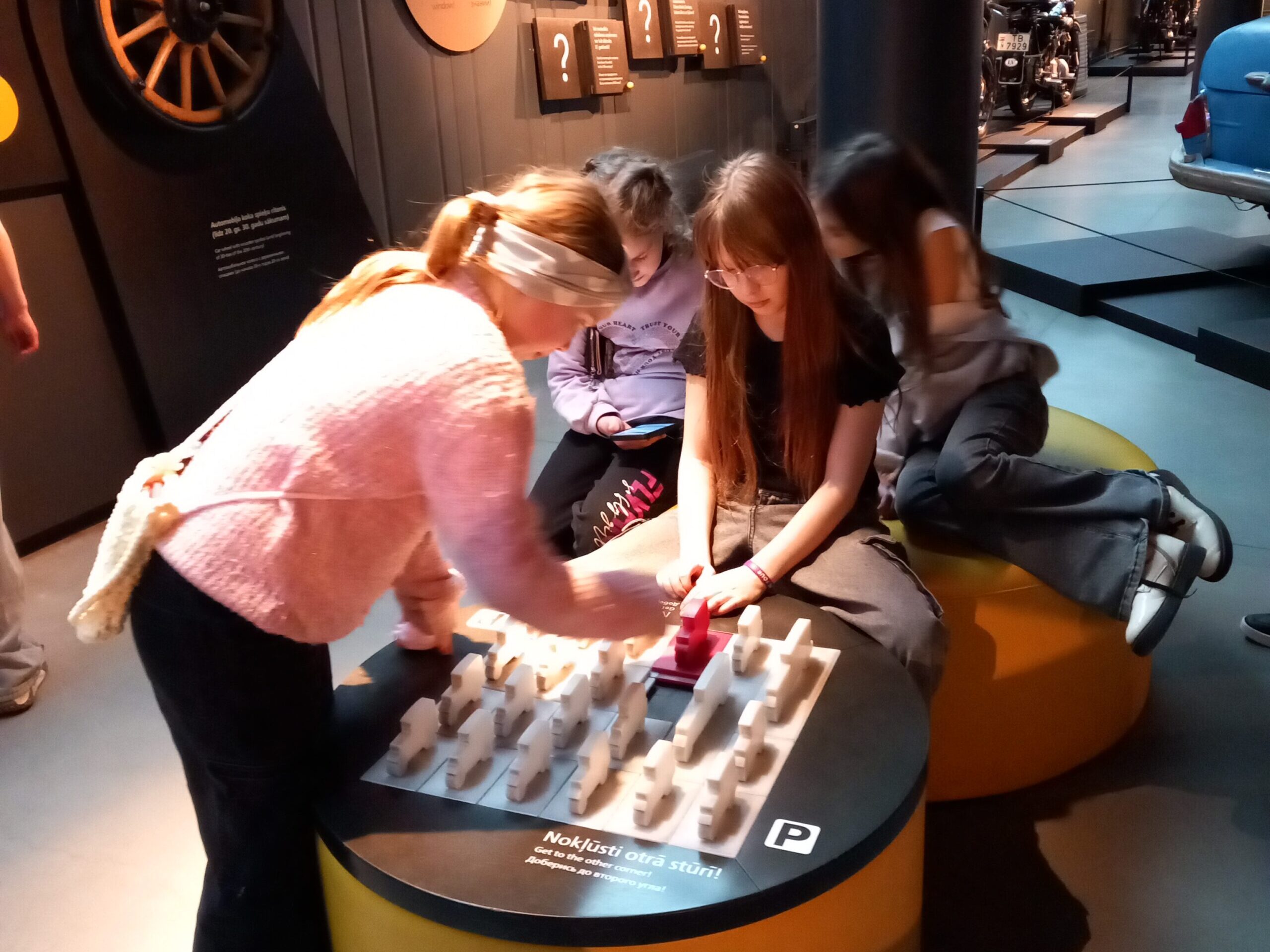Otrajā nodarbības daļā skolēni komandās piedalījās interaktīvā mobilajā spēlē “Stāsti muzejā”. Izmantojot viedtālruņus, viņi pildīja uzdevumus, kas saistīti ar autoindustrijas vēsturi Latvijā un pasaulē, kā arī ar muzeja darbību. Šī aktivitāte veicināja sadarbību, radošo domāšanu un informācijas meklēšanas prasmes.
