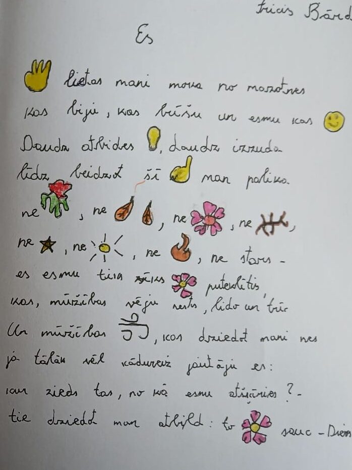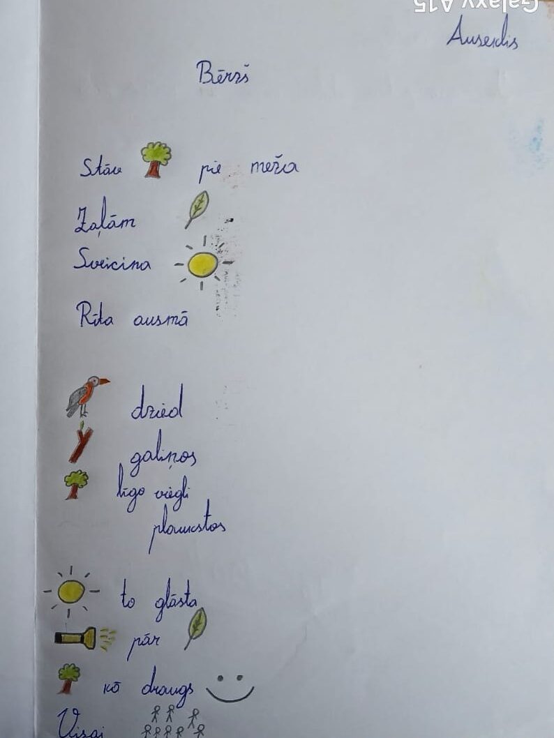 Skolēniem bija iespēja izpausties radoši ar sev tuva autora dzejoli – to uzrakstot un vizualizējot. Tika izmēģināta dzejas radīšana arī mūsdienīgā formā – emodži simbolos, atklājot, ka arī digitālie tēli var kļūt par dzejas valodu. Dzejas mēnesis apliecināja, ka dzeja nav tikai grāmatu lappusēs – tā dzīvo mūsos pašos un var izpausties visdažādākajos veidos.