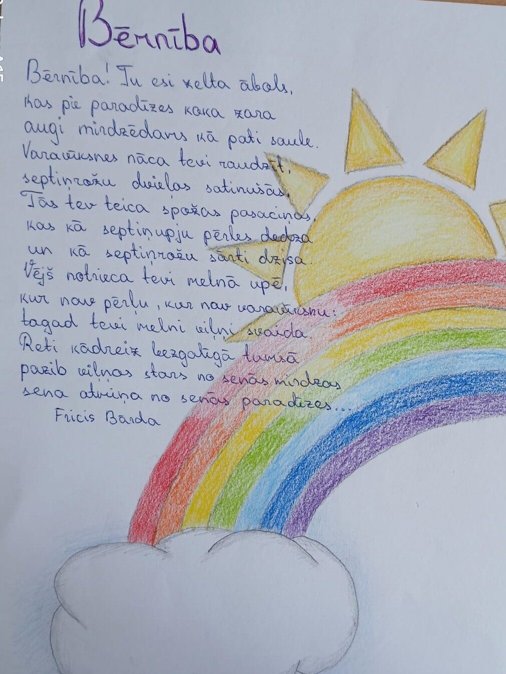 2.b klase izvēlējās Guntara Rača dzejoli, jo tas viņiem likās ļoti īpašs un sirdi sildošs. Dzejoli viņi mēģinās paturēt savās atmiņās un sekos tā saturam.