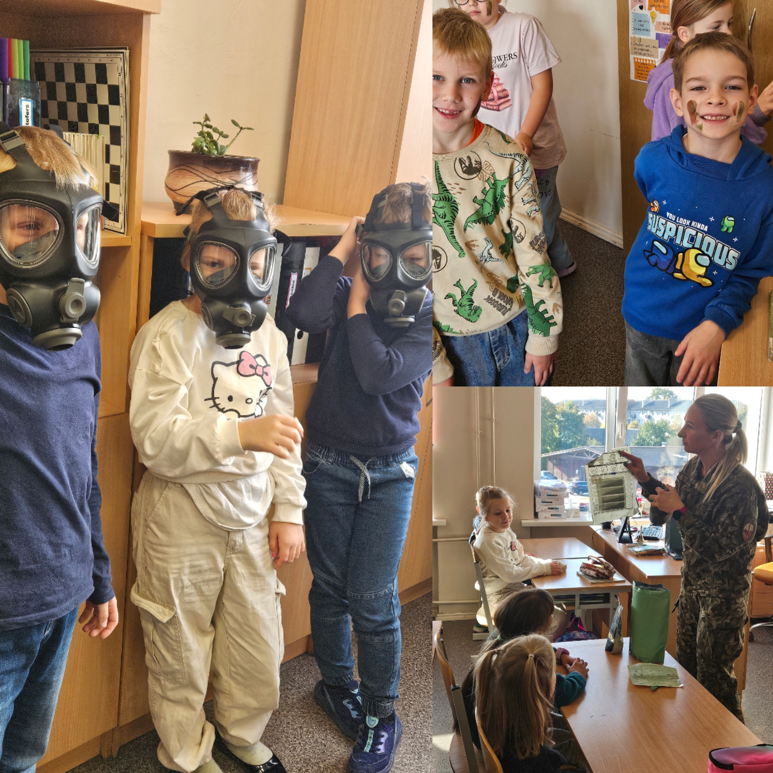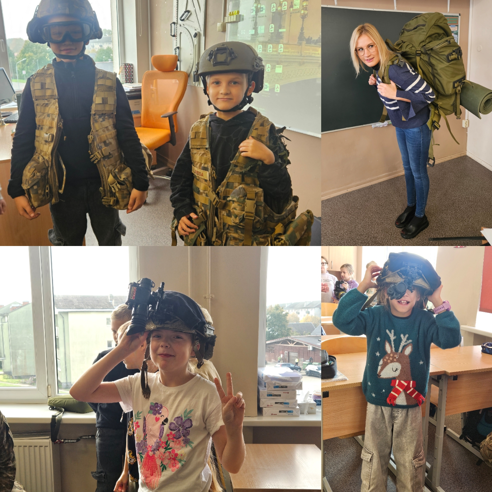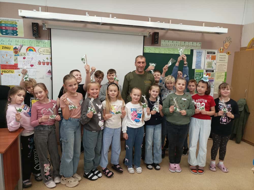 Karjeras nedēļas ietvaros 2.b klase iepazinās ar NBS profesiju pārstāvjiem! Pie skolēniem klasē ciemojās – virsnieks, personāla speciālistes un plānošanas daļas speciāliste. Iepazīstinot ar ikdienas pienākumiem NBS, skolēniem un audzinātājai Kristai Ciekalei bija iespēja pacelt un ieskatīties zemessargu somā, runāt speciālu tekstu rācijās, skatīties ar nakts redzamības optiku, izmēģināt kamuflāžas krāsas zīmuli, uzvilkt gāzes masku, kā arī pagaršot speciāli pagatavotu sausās uzturdevas ēdienreizi. 2.b klases skolēni bija ļoti ieinteresēti stāstītajā un redzētajā un ļoti novērtē šīs profesijas pārstāvjus un viņu darbu! Visa klase saka LIELU PALDIES par ciemošanos un jaunām zināšanām!