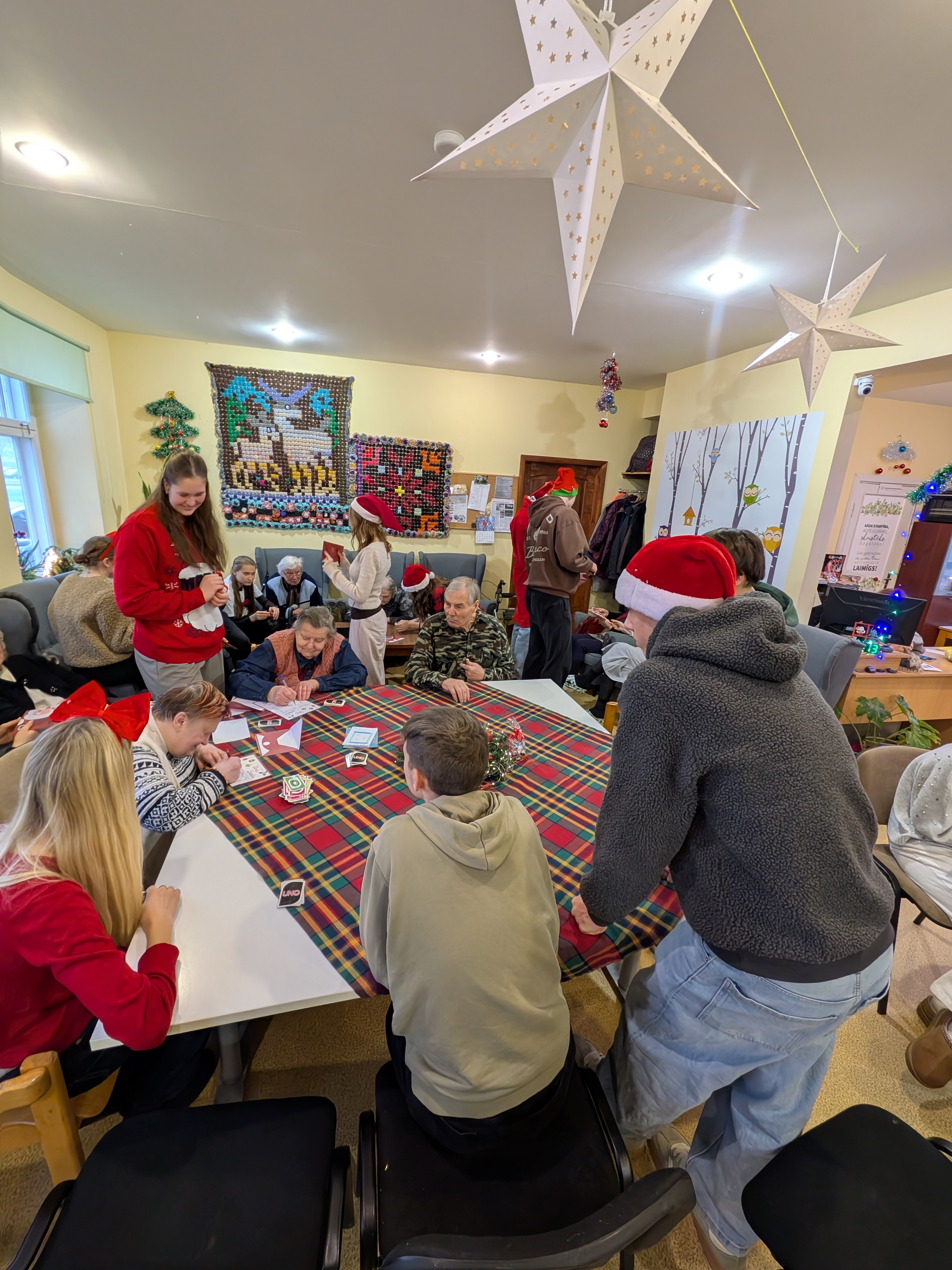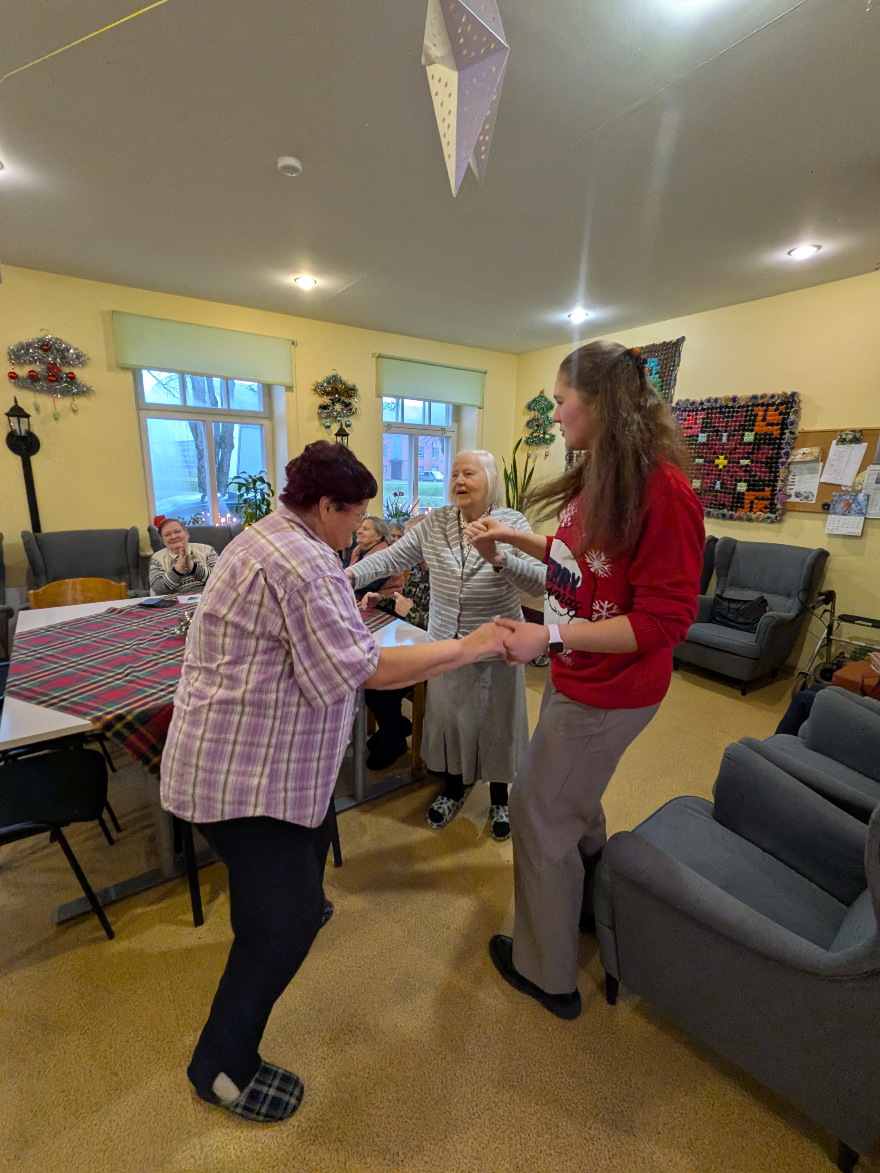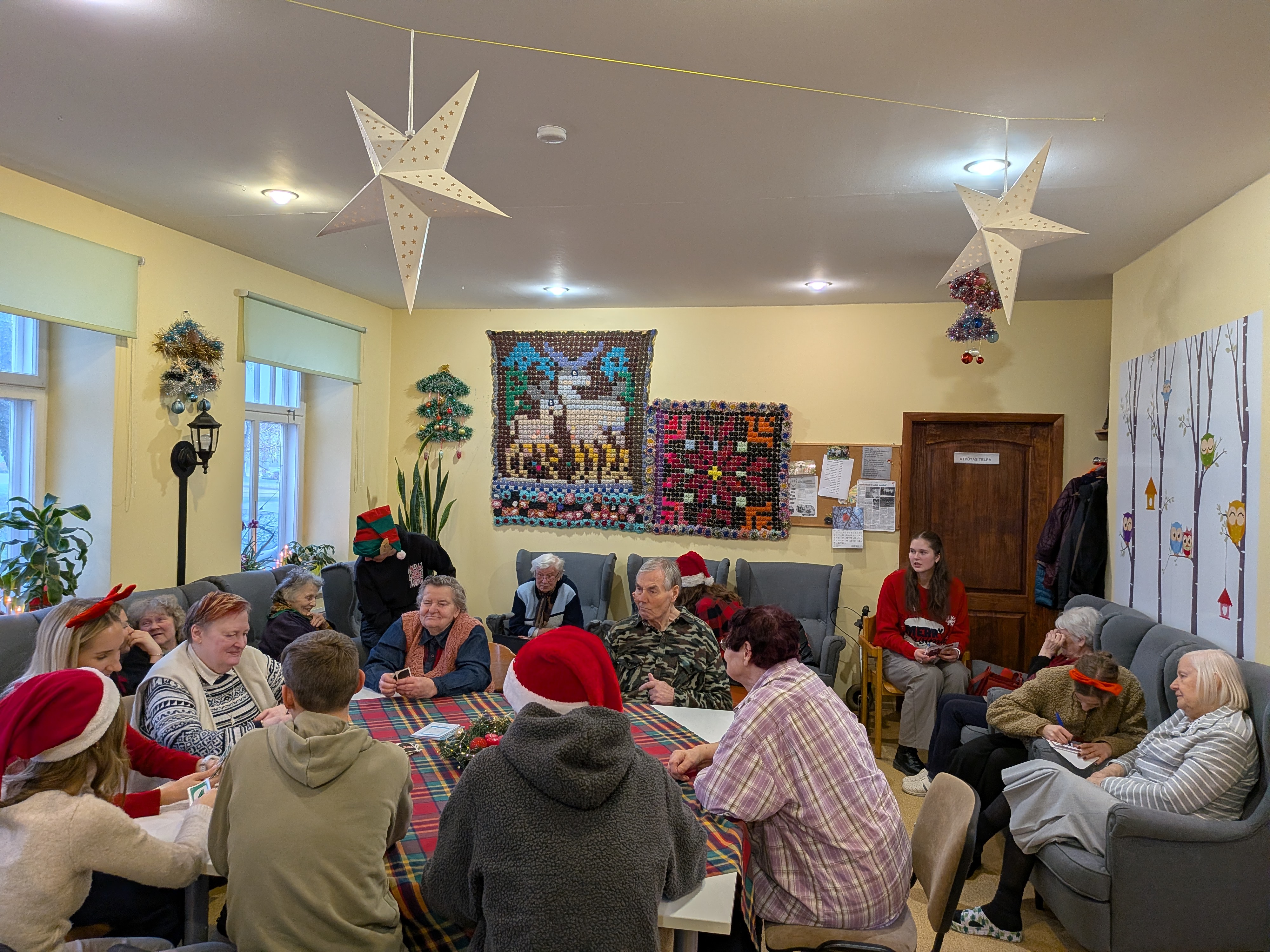 Tikšanās laikā seniori tika iepriecināti ar dziesmām, mīklu minēšanu, cienastu un dažādām spēlēm, kas rosināja aktīvu līdzdalību un draudzīgu sarunu. Kopā būšana piepildīja telpu ar smaidiem, smiekliem un patiesu prieku, radot siltu un sirsnīgu atmosfēru gan jauniešiem, gan senioriem.