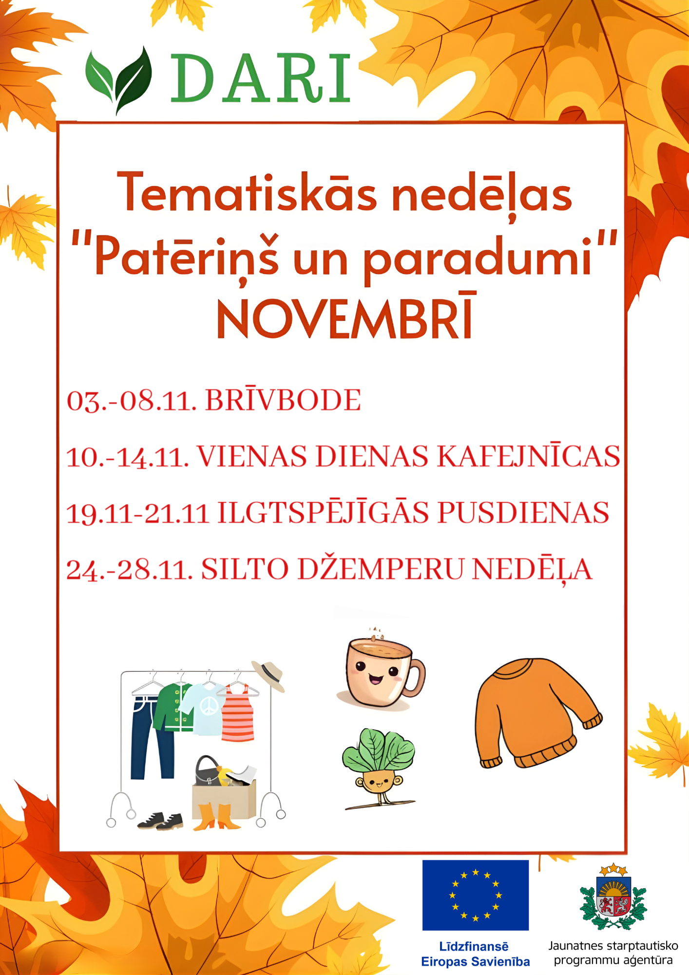 Šomēnes turpinām projekta “DARI – Domā Atbildīgi, Rīkojies Ilgtspējīgi” aktivitātes, kas aicina skolēnus un skolotājus padomāt par videi draudzīgiem un ilgtspējīgiem ikdienas paradumiem.